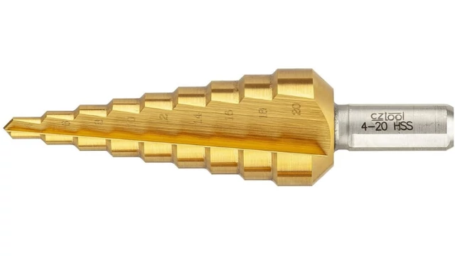 Lépcsős lemezfúró - D4-20 A lemezfúrók jellegzetessége, hogy nincs élszalagjuk a csigafúróval ellentétben. A hengeresen kialakított lépcsők, különösen pontos furatátmérőt eredményeznek. Lépcsős lemezfúró gyorsacélból készült, általános felhasználásra, lemezek fúrásához alkalmazhatóak.